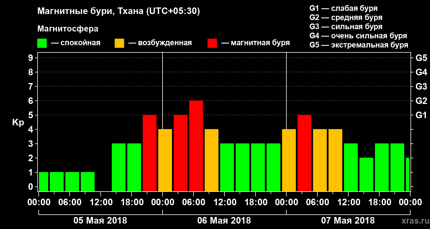 Изменения геомагнитного индекса Kp с 5 по 7 мая 2018 года для средних широт