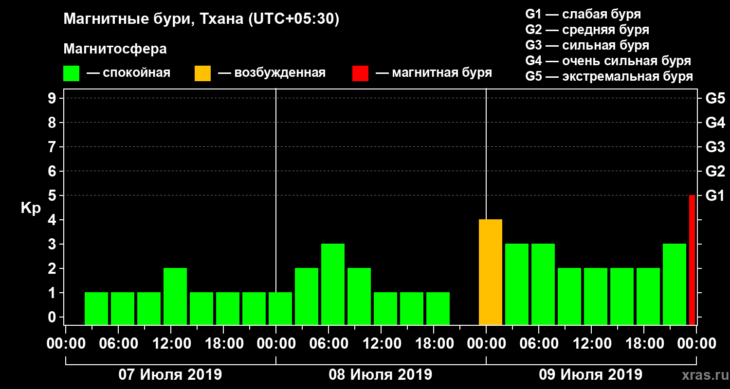 Изменения геомагнитного индекса Kp с 7 по 9 июля 2019 года для средних широт