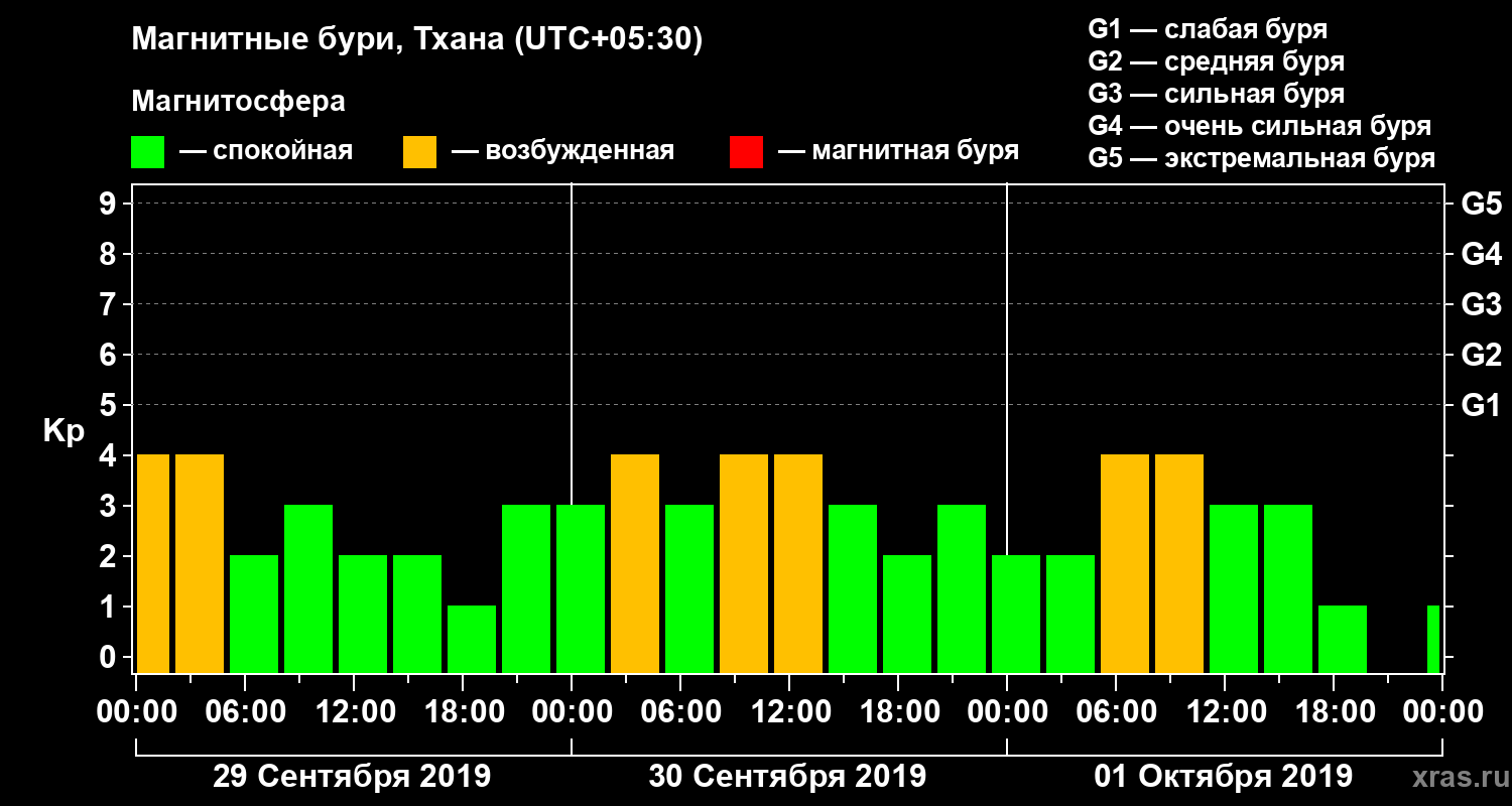 Изменения геомагнитного индекса Kp с 29 сентября по 1 октября 2019 года для средних широт