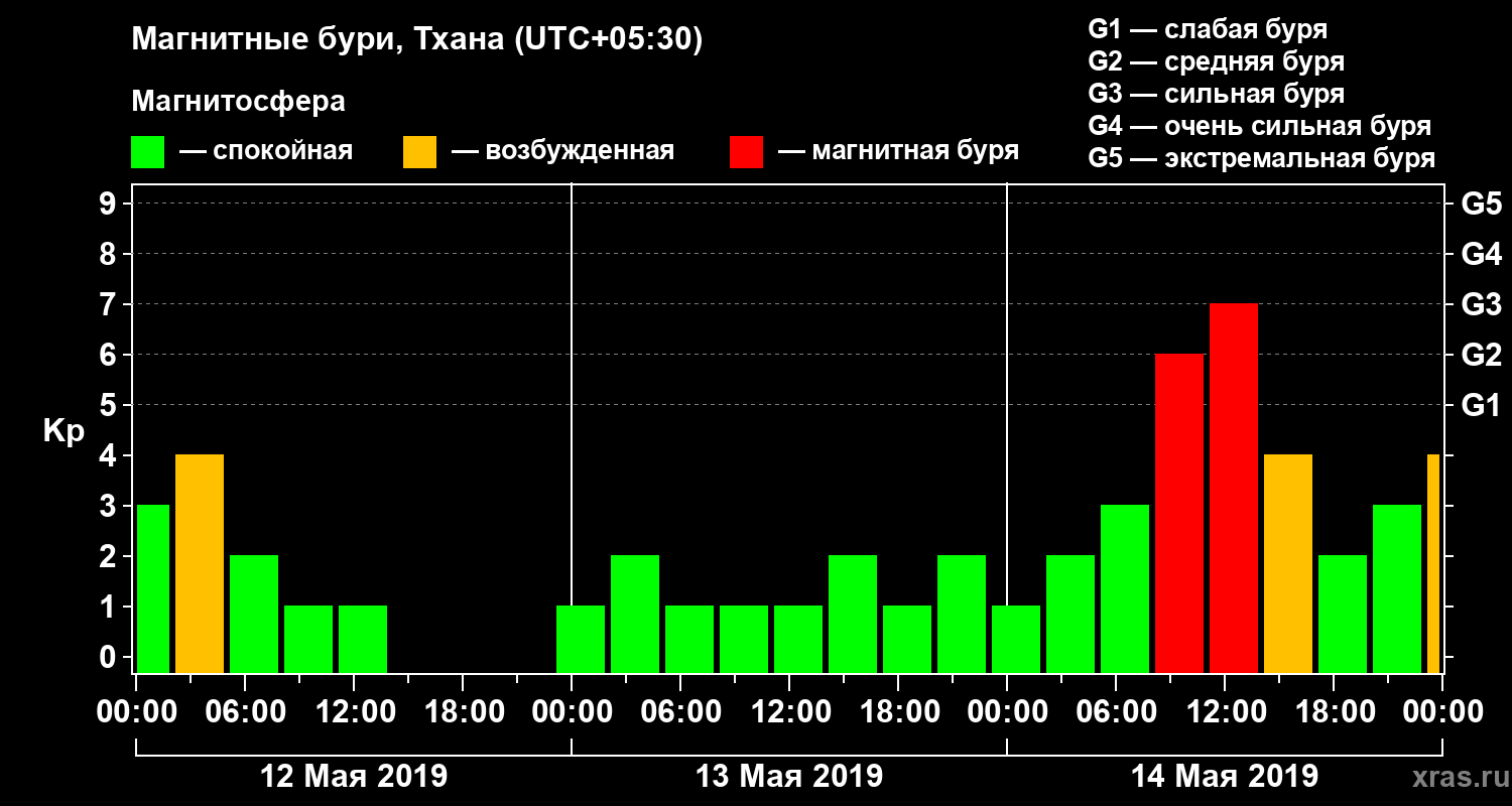 Изменения геомагнитного индекса Kp с 12 по 14 мая 2019 года для средних широт