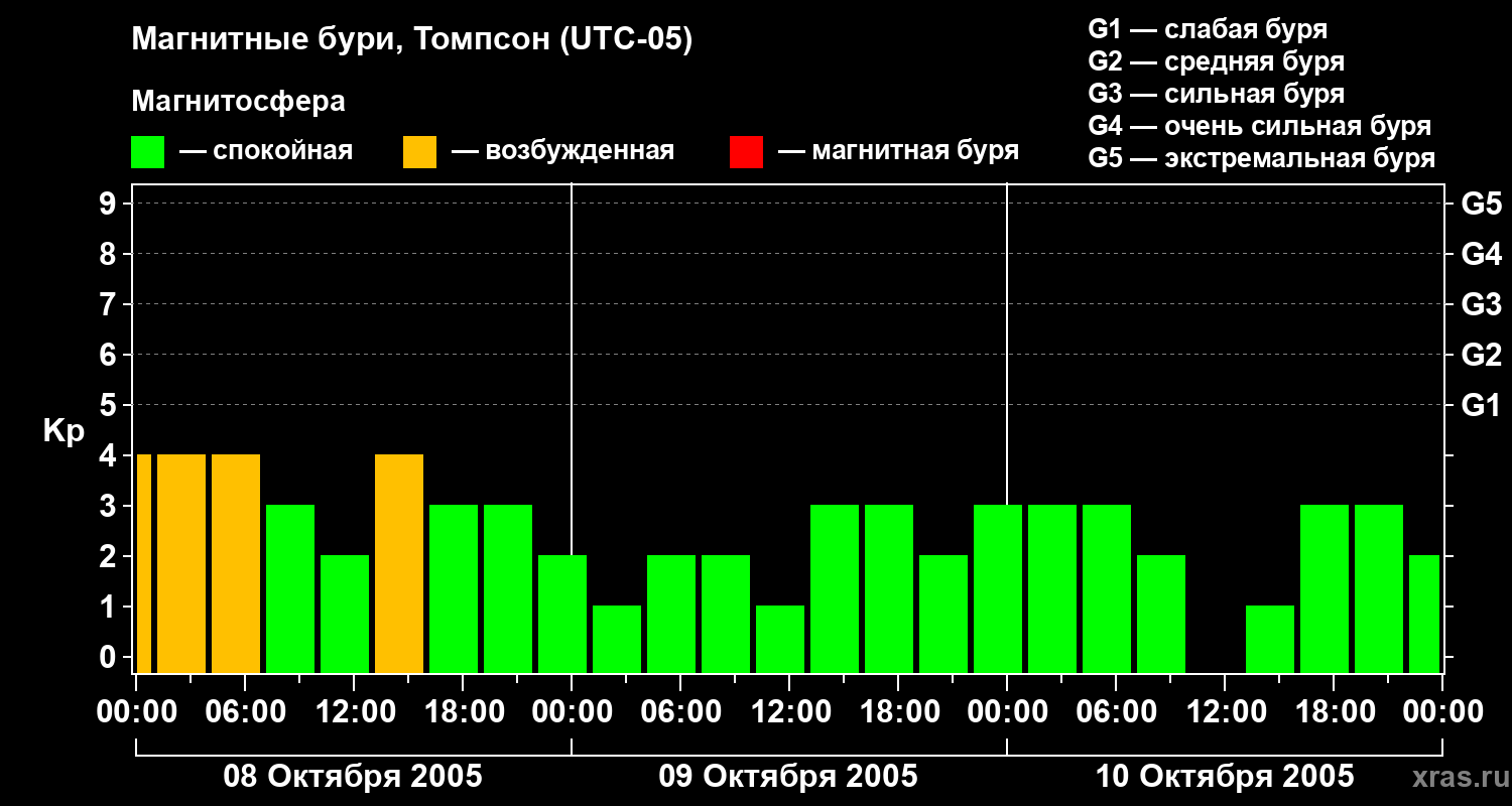 Изменения геомагнитного индекса Kp с 8 по 10 октября 2005 года для средних широт