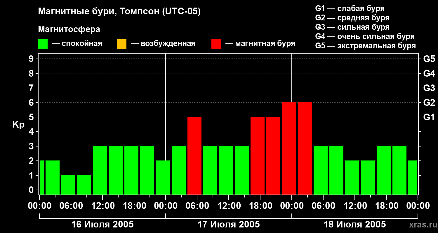 Изменения геомагнитного индекса Kp с 16 по 18 июля 2005 года для средних широт