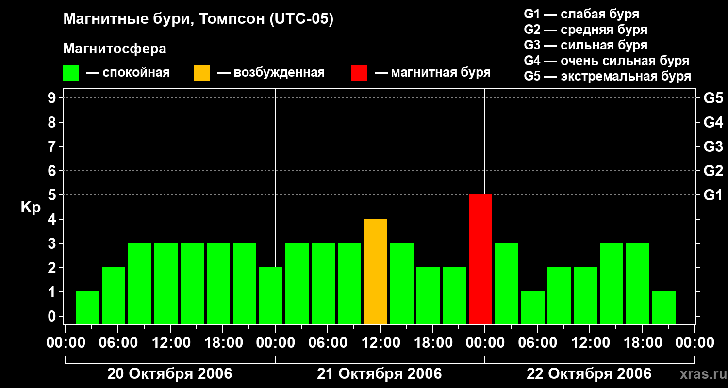 Изменения геомагнитного индекса Kp с 20 по 22 октября 2006 года для средних широт