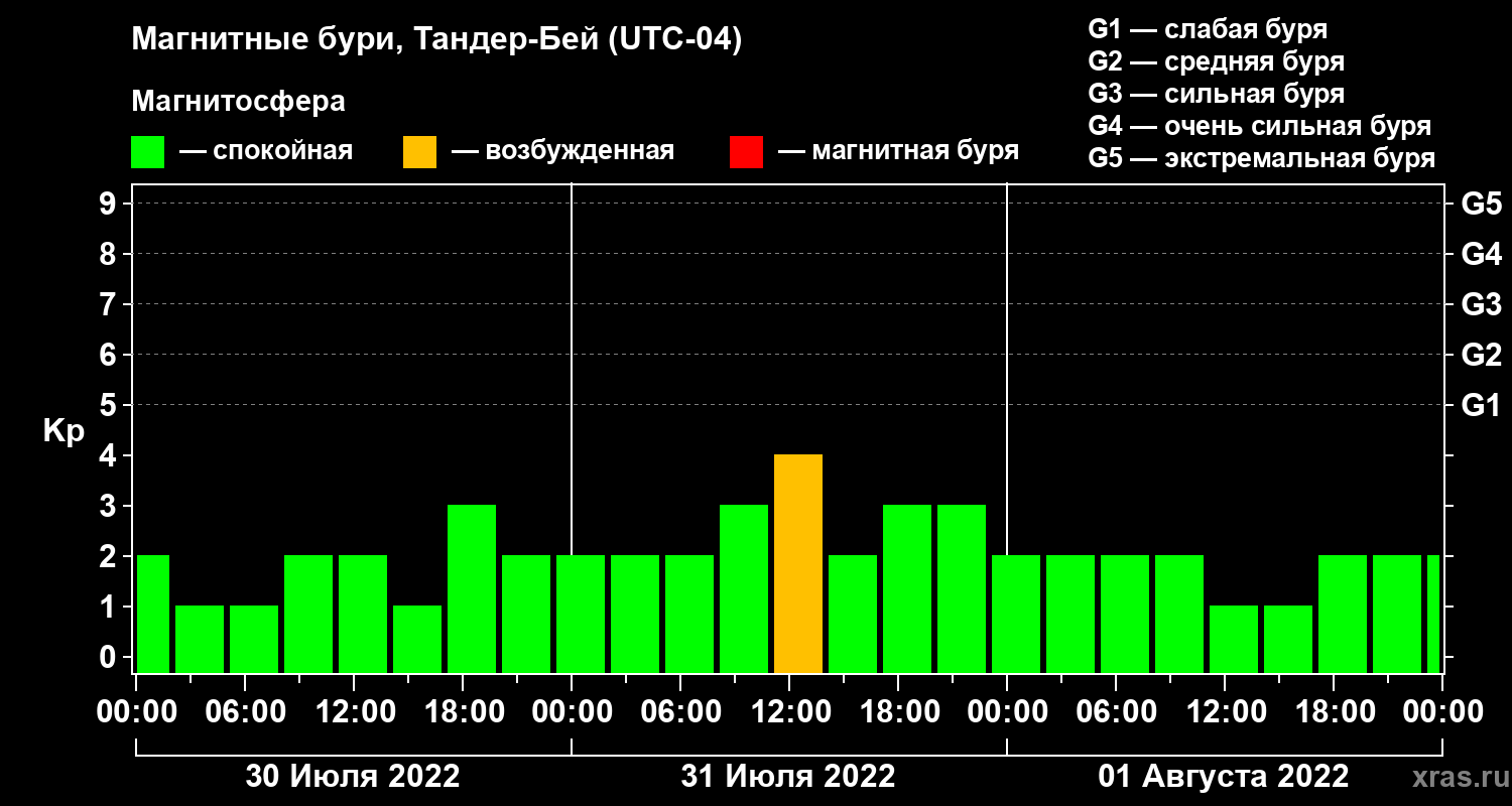 Изменения геомагнитного индекса Kp с 30 июля по 1 августа 2022 года для средних широт