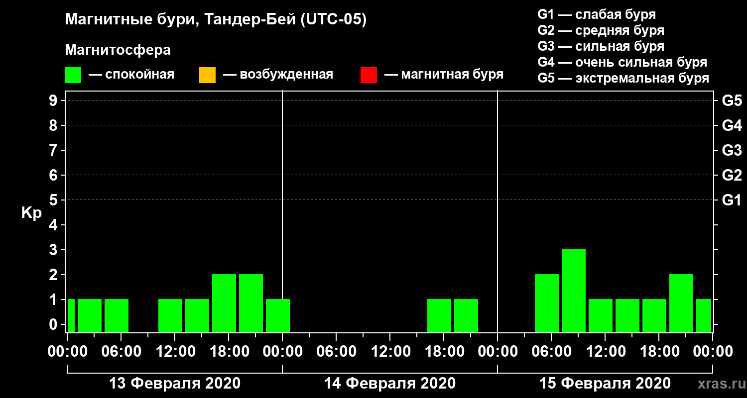 Изменения геомагнитного индекса Kp с 13 по 15 февраля 2020 года для средних широт