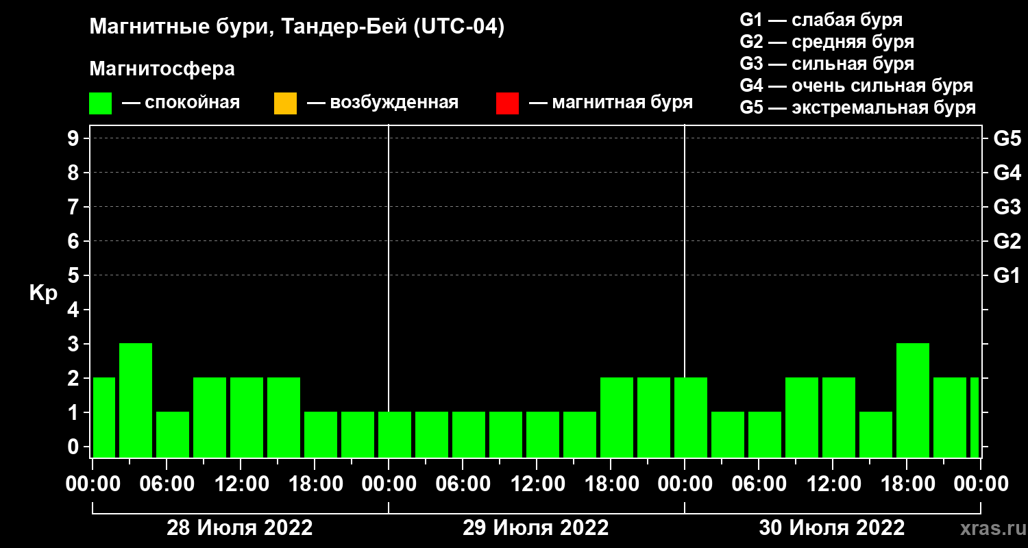 Изменения геомагнитного индекса Kp с 28 по 30 июля 2022 года для средних широт