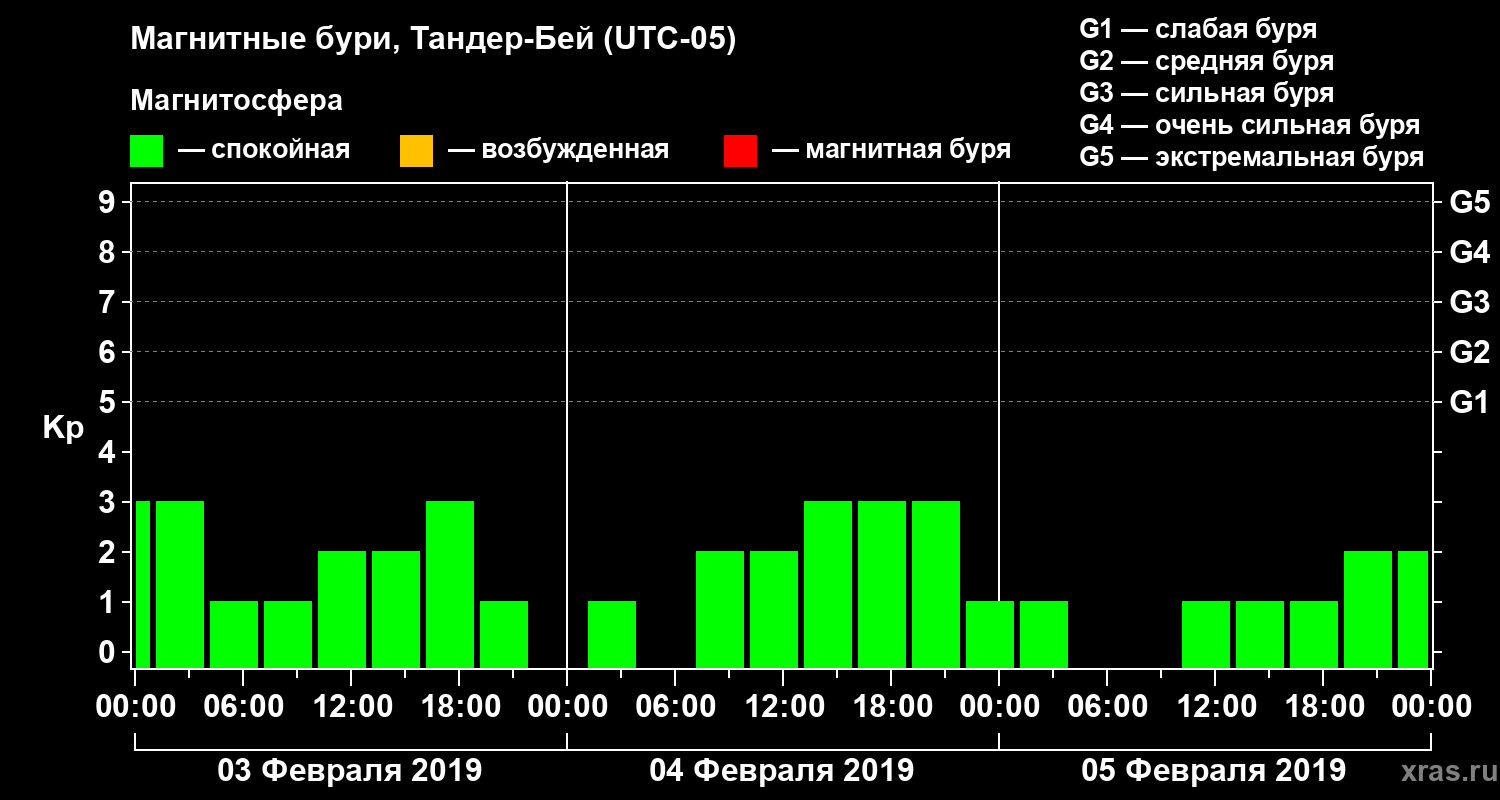 Изменения геомагнитного индекса Kp с 3 по 5 февраля 2019 года для средних широт