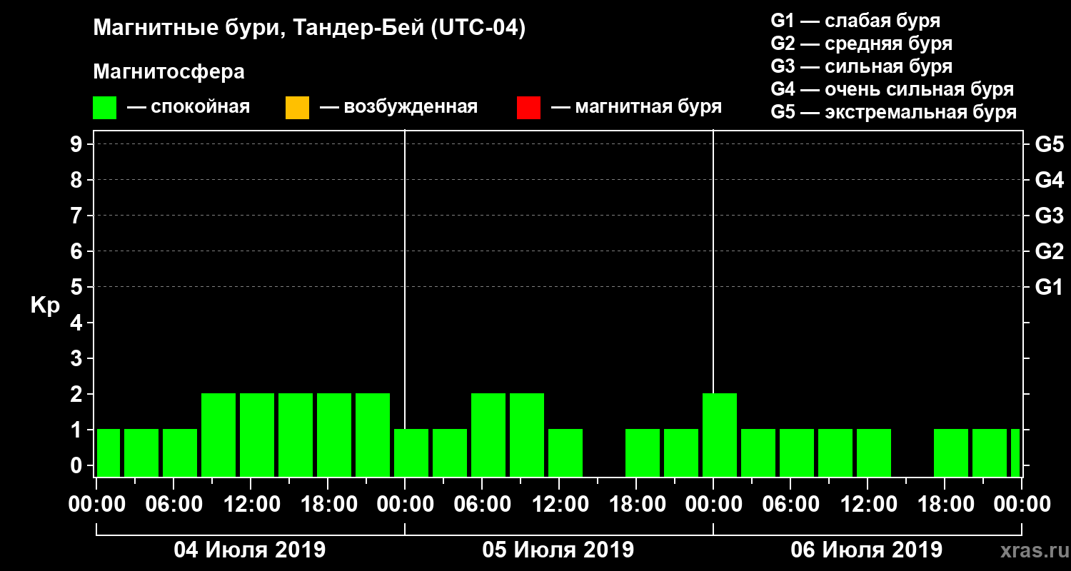 Изменения геомагнитного индекса Kp с 4 по 6 июля 2019 года для средних широт