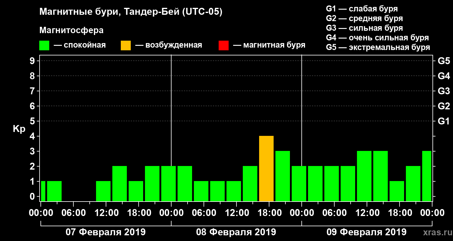 Изменения геомагнитного индекса Kp с 7 по 9 февраля 2019 года для средних широт