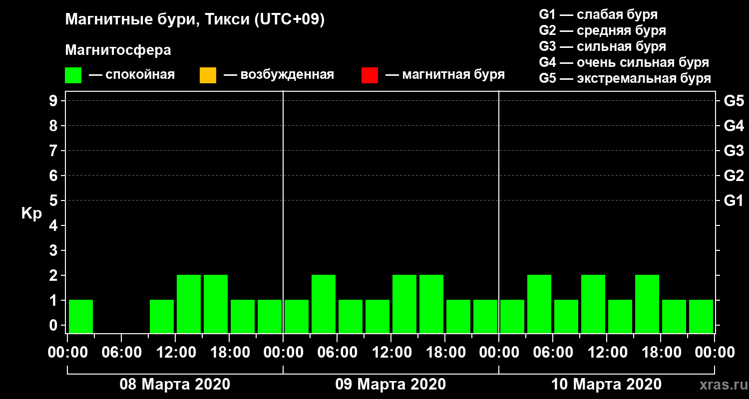 Изменения геомагнитного индекса Kp с 8 по 10 марта 2020 года для средних широт