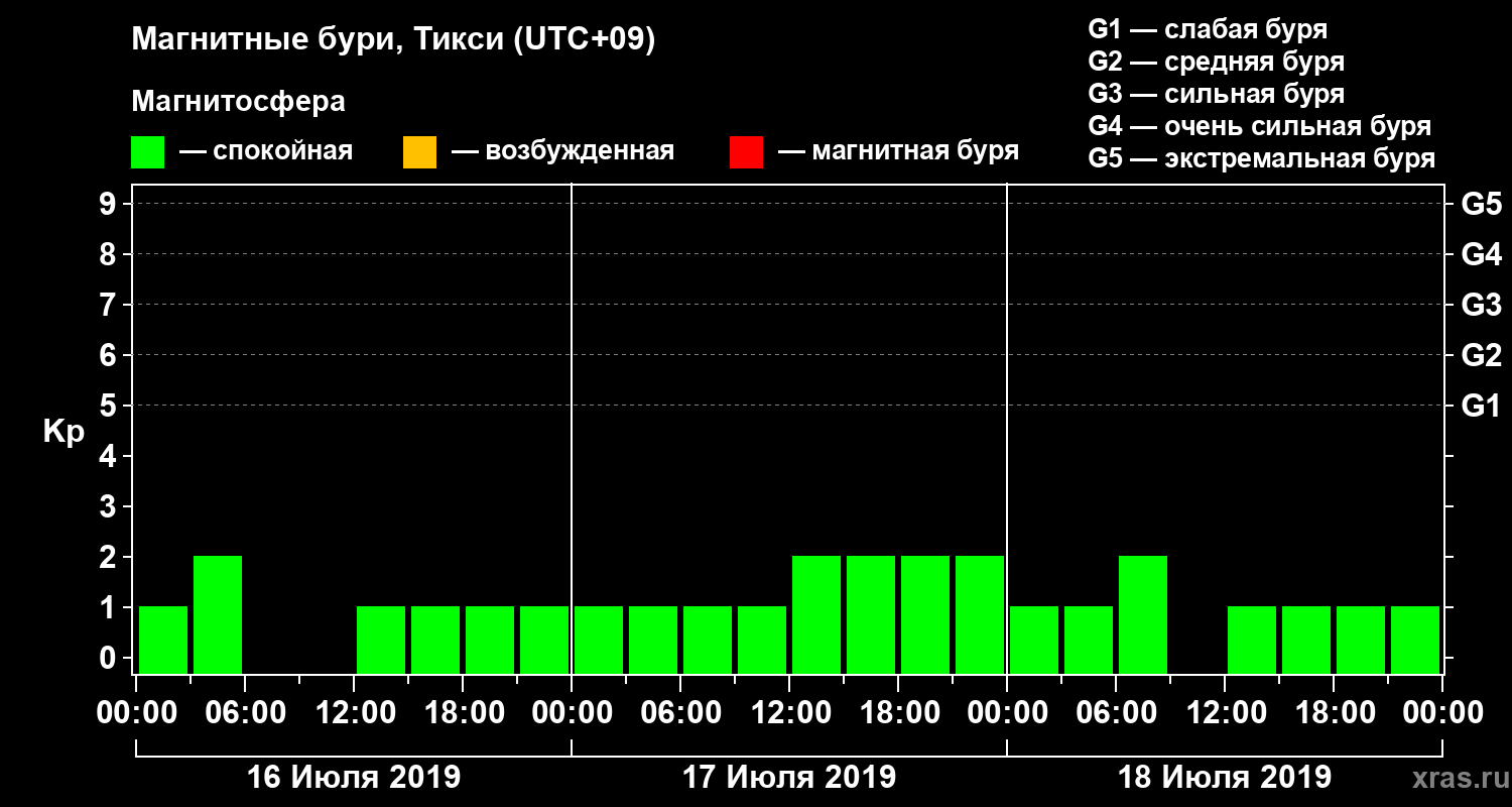 Изменения геомагнитного индекса Kp с 16 по 18 июля 2019 года для средних широт