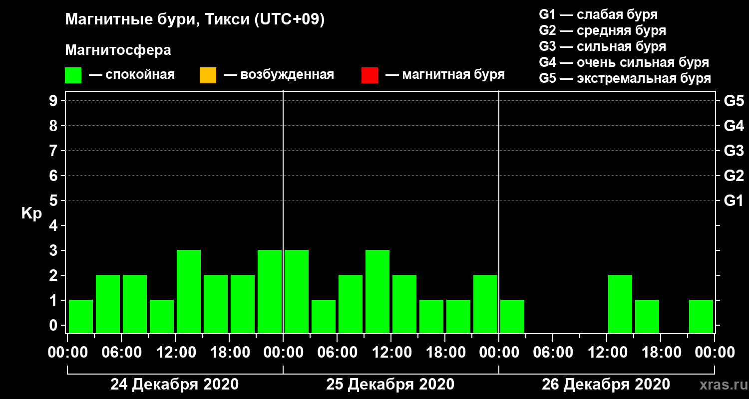 Изменения геомагнитного индекса Kp с 24 по 26 декабря 2020 года для средних широт