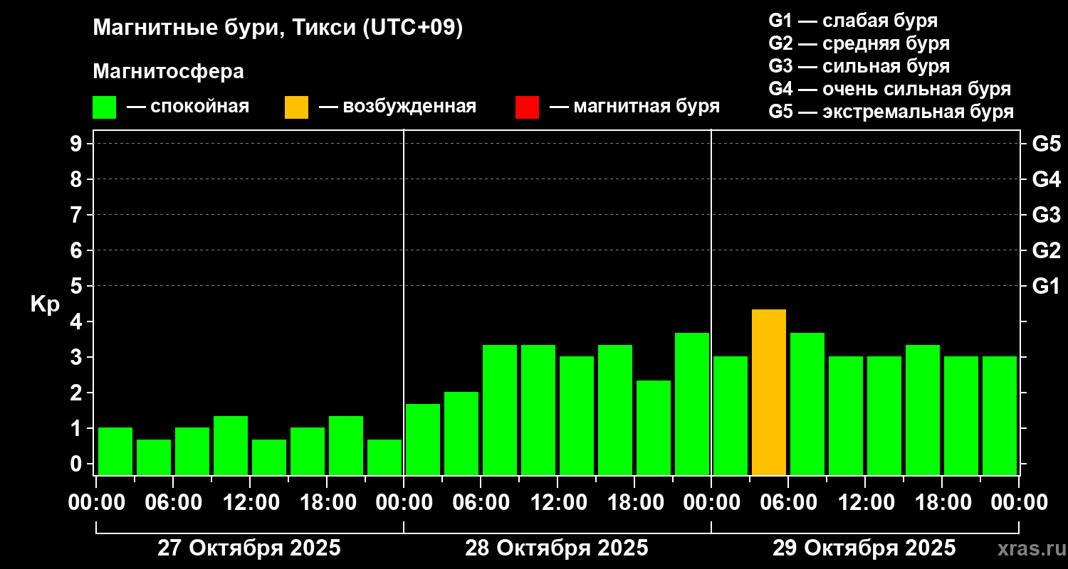 Изменения геомагнитного индекса Kp с 27 по 29 октября 2025 года для средних широт