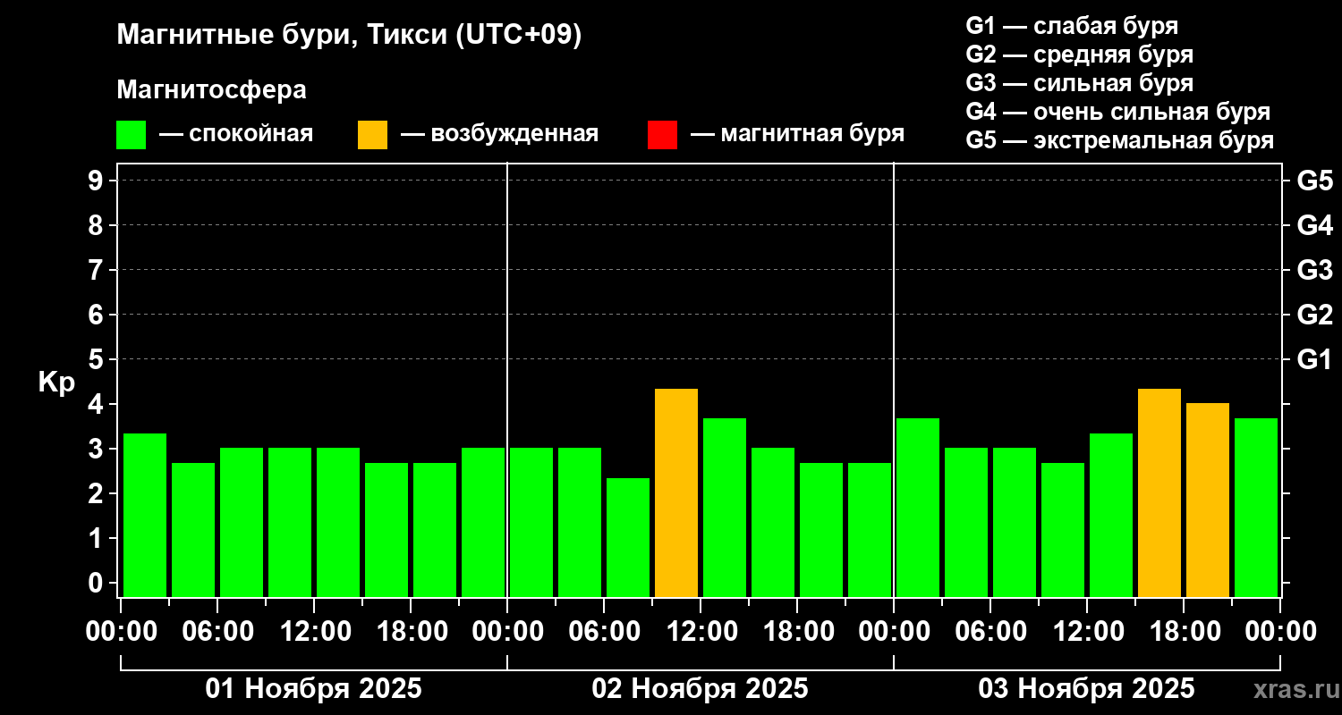 Изменения геомагнитного индекса Kp с 1 по 3 ноября 2025 года для средних широт