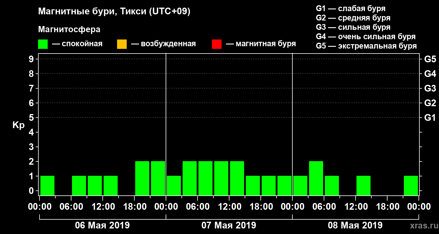 Изменения геомагнитного индекса Kp с 6 по 8 мая 2019 года для средних широт