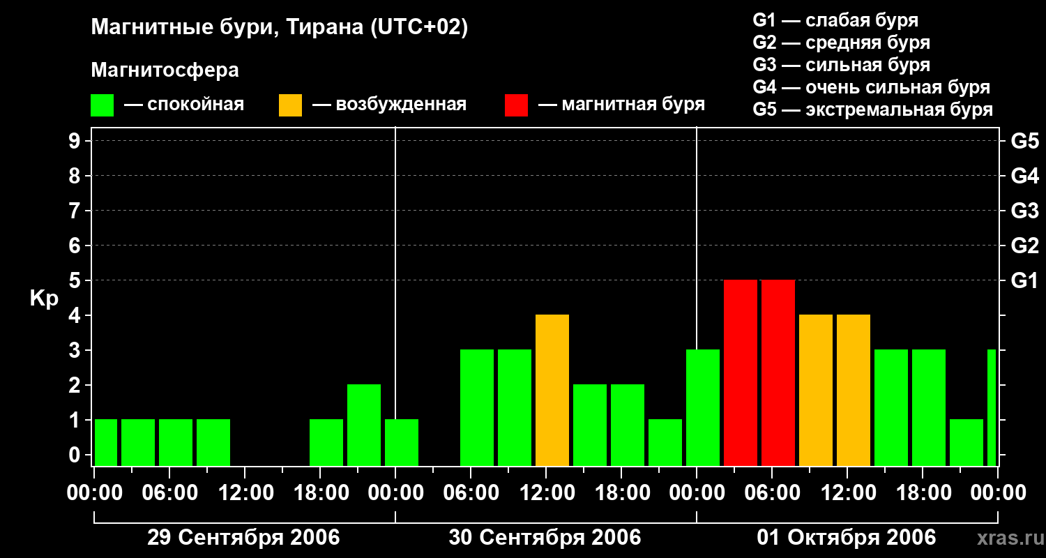 Изменения геомагнитного индекса Kp с 29 сентября по 1 октября 2006 года для средних широт