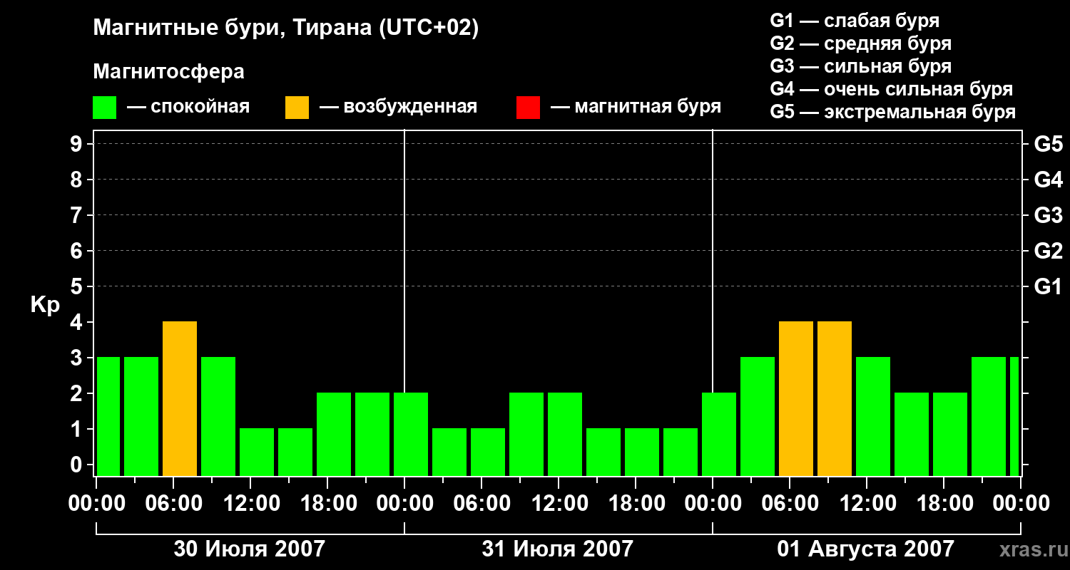 Изменения геомагнитного индекса Kp с 30 июля по 1 августа 2007 года для средних широт