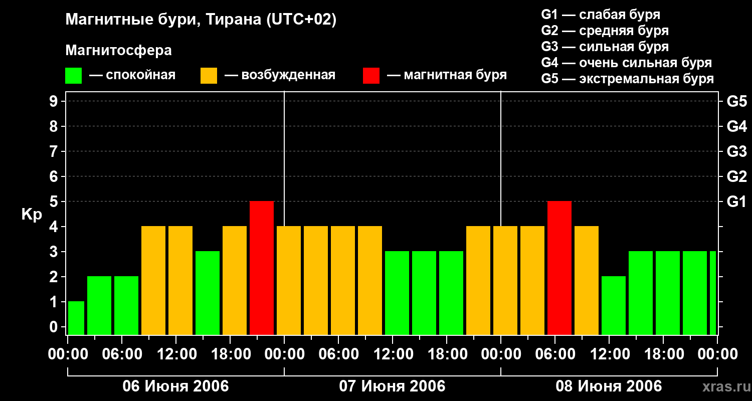 Изменения геомагнитного индекса Kp с 6 по 8 июня 2006 года для средних широт