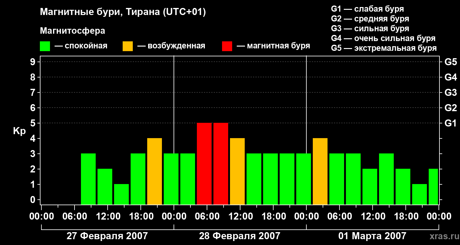 Изменения геомагнитного индекса Kp с 27 февраля по 1 марта 2007 года для средних широт