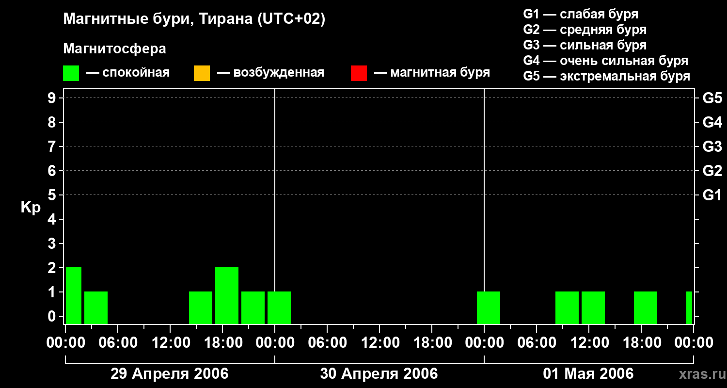 Изменения геомагнитного индекса Kp с 29 апреля по 1 мая 2006 года для средних широт
