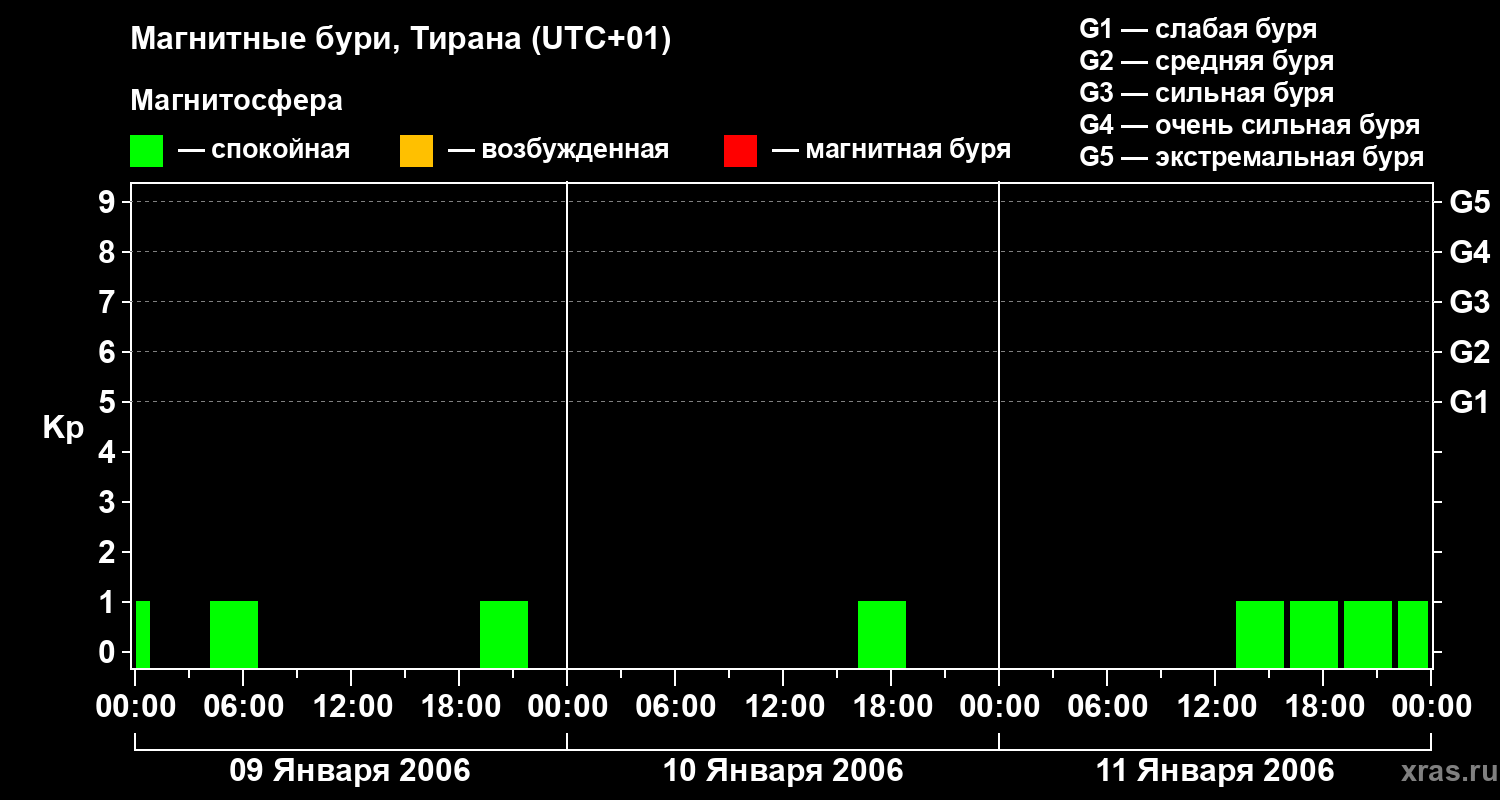 Изменения геомагнитного индекса Kp с 9 по 11 января 2006 года для средних широт