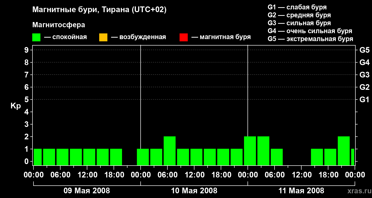 Изменения геомагнитного индекса Kp с 9 по 11 мая 2008 года для средних широт