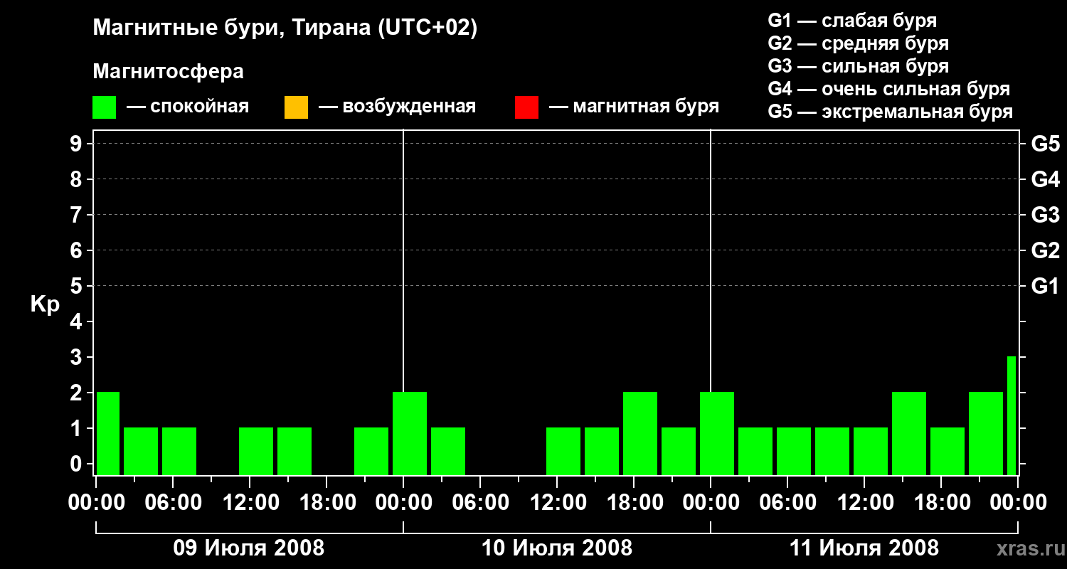 Изменения геомагнитного индекса Kp с 9 по 11 июля 2008 года для средних широт