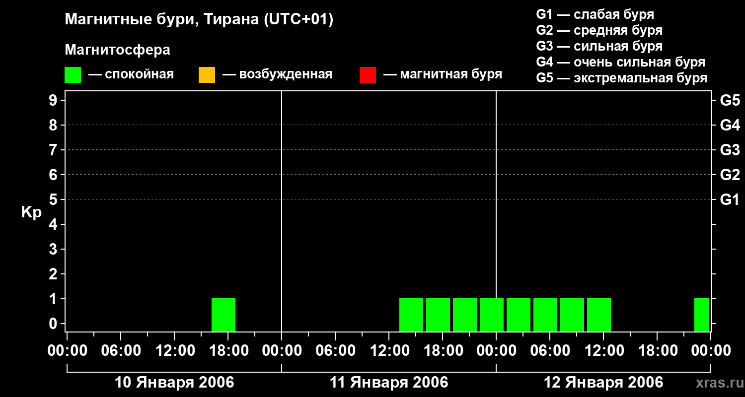Изменения геомагнитного индекса Kp с 10 по 12 января 2006 года для средних широт