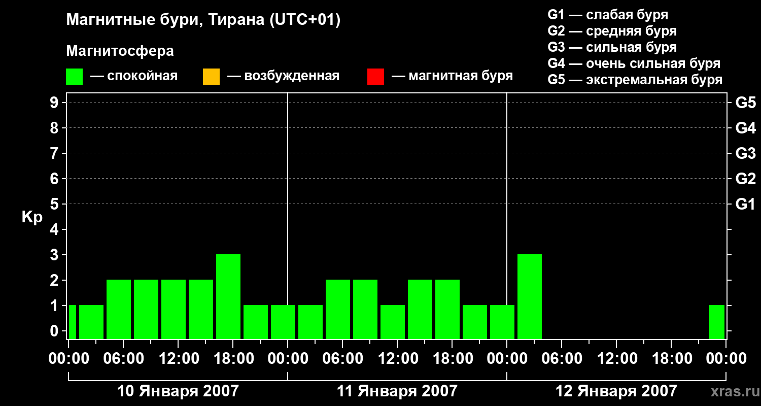 Изменения геомагнитного индекса Kp с 10 по 12 января 2007 года для средних широт