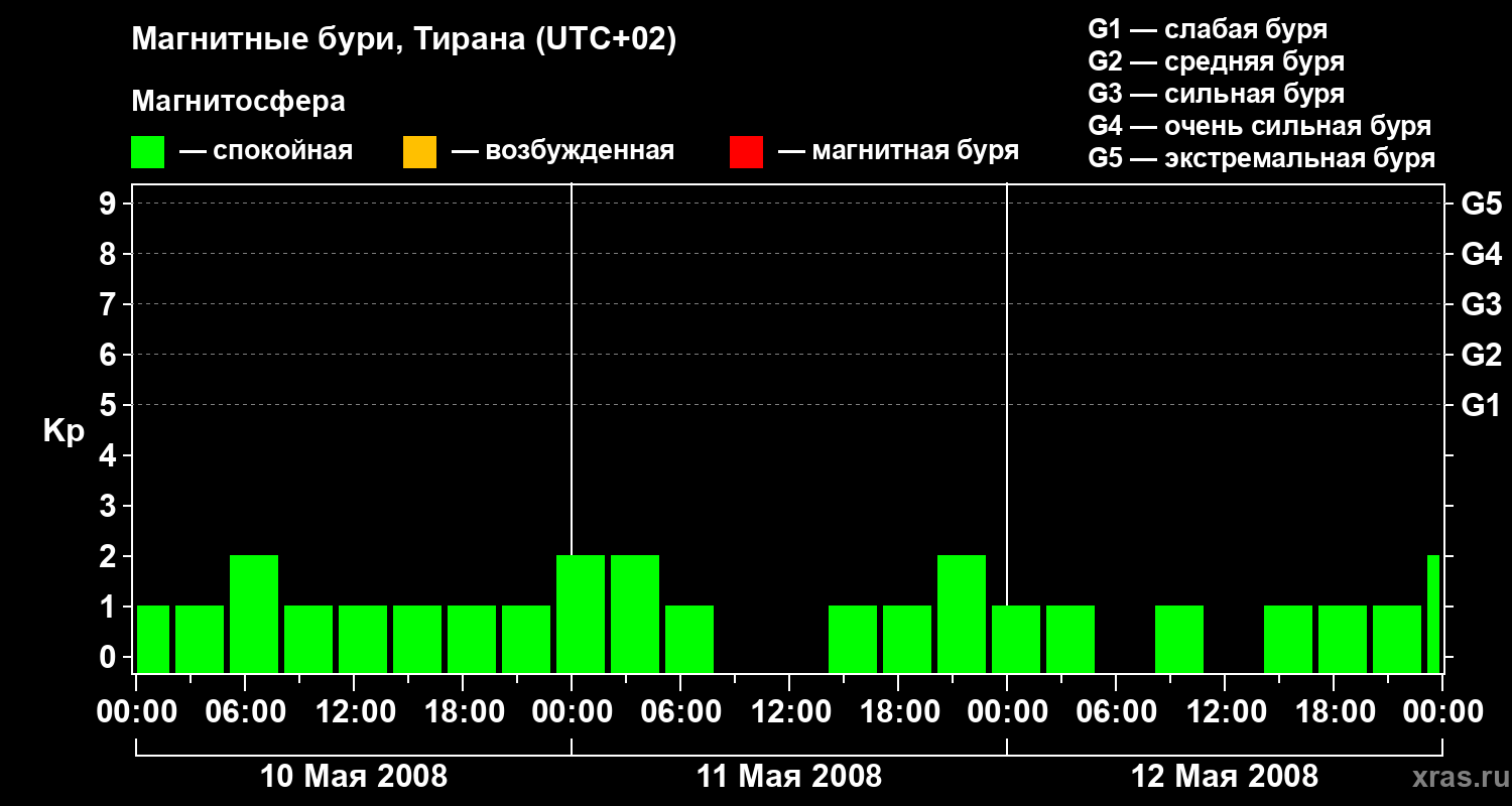 Изменения геомагнитного индекса Kp с 10 по 12 мая 2008 года для средних широт