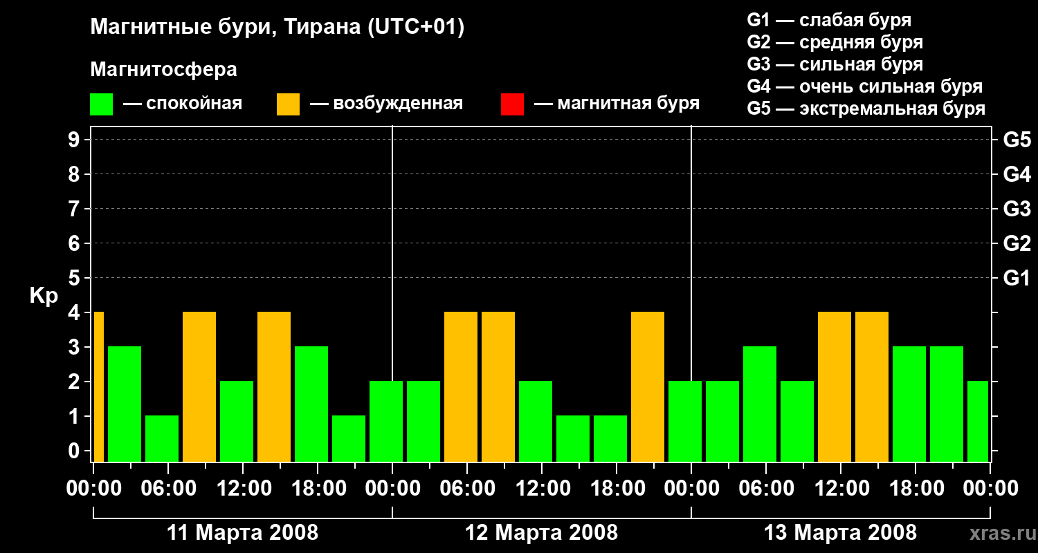 Изменения геомагнитного индекса Kp с 11 по 13 марта 2008 года для средних широт