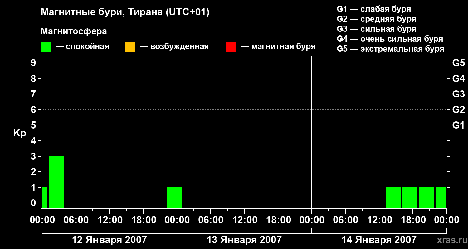 Изменения геомагнитного индекса Kp с 12 по 14 января 2007 года для средних широт
