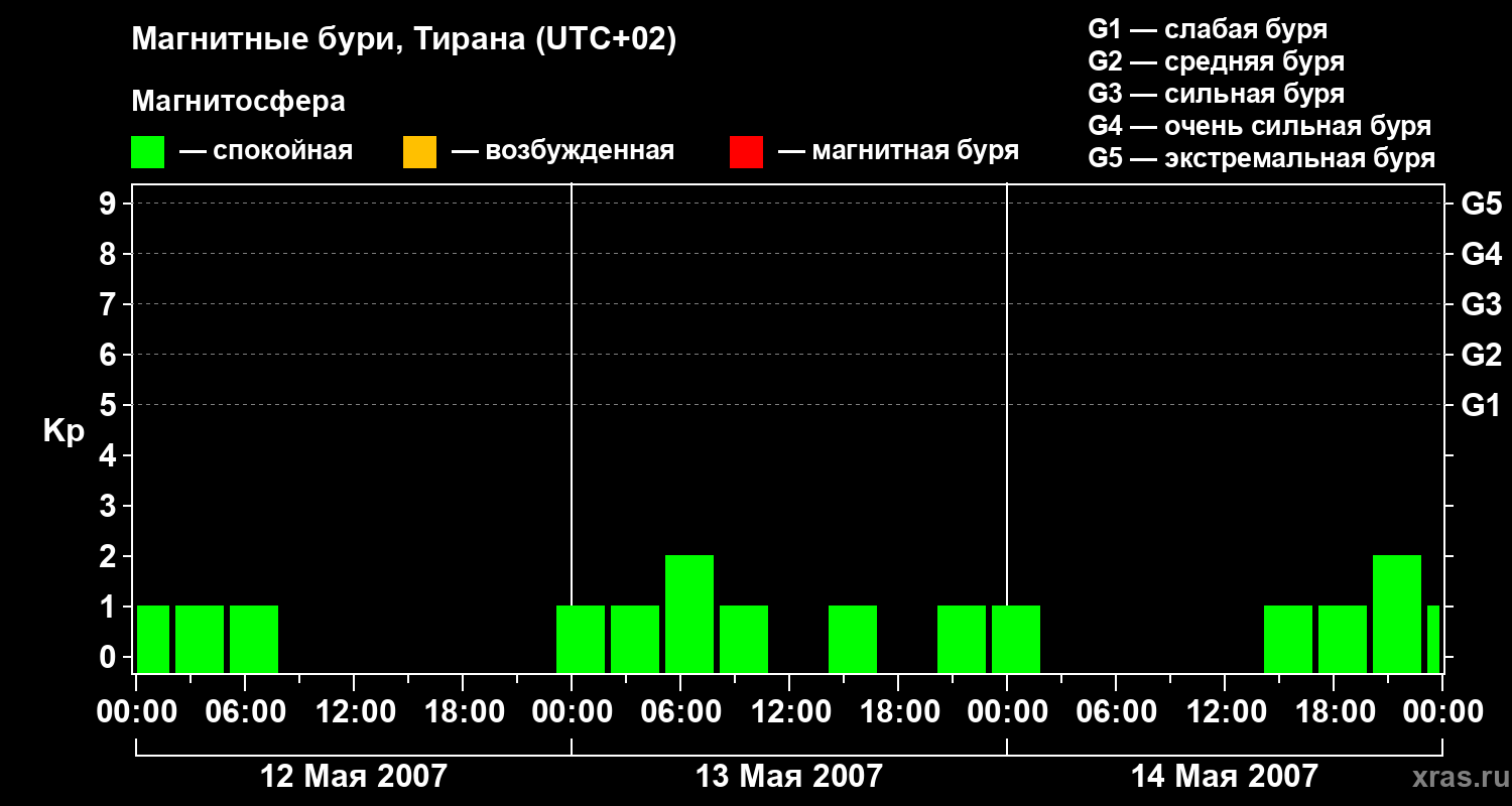 Изменения геомагнитного индекса Kp с 12 по 14 мая 2007 года для средних широт