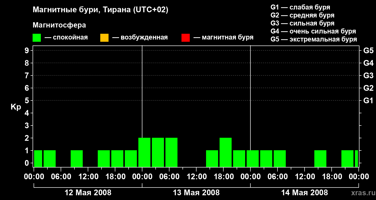 Изменения геомагнитного индекса Kp с 12 по 14 мая 2008 года для средних широт