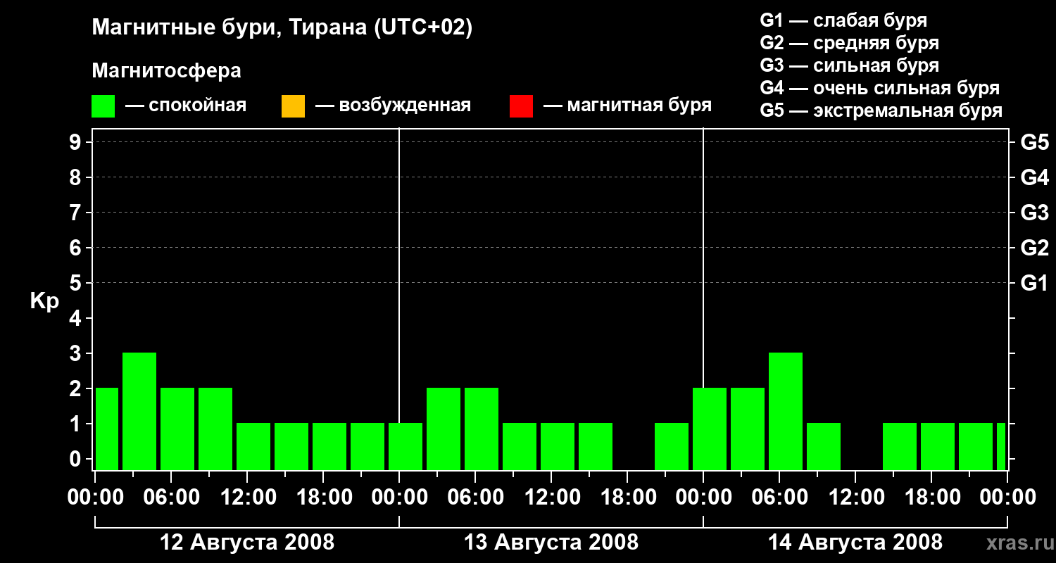 Изменения геомагнитного индекса Kp с 12 по 14 августа 2008 года для средних широт