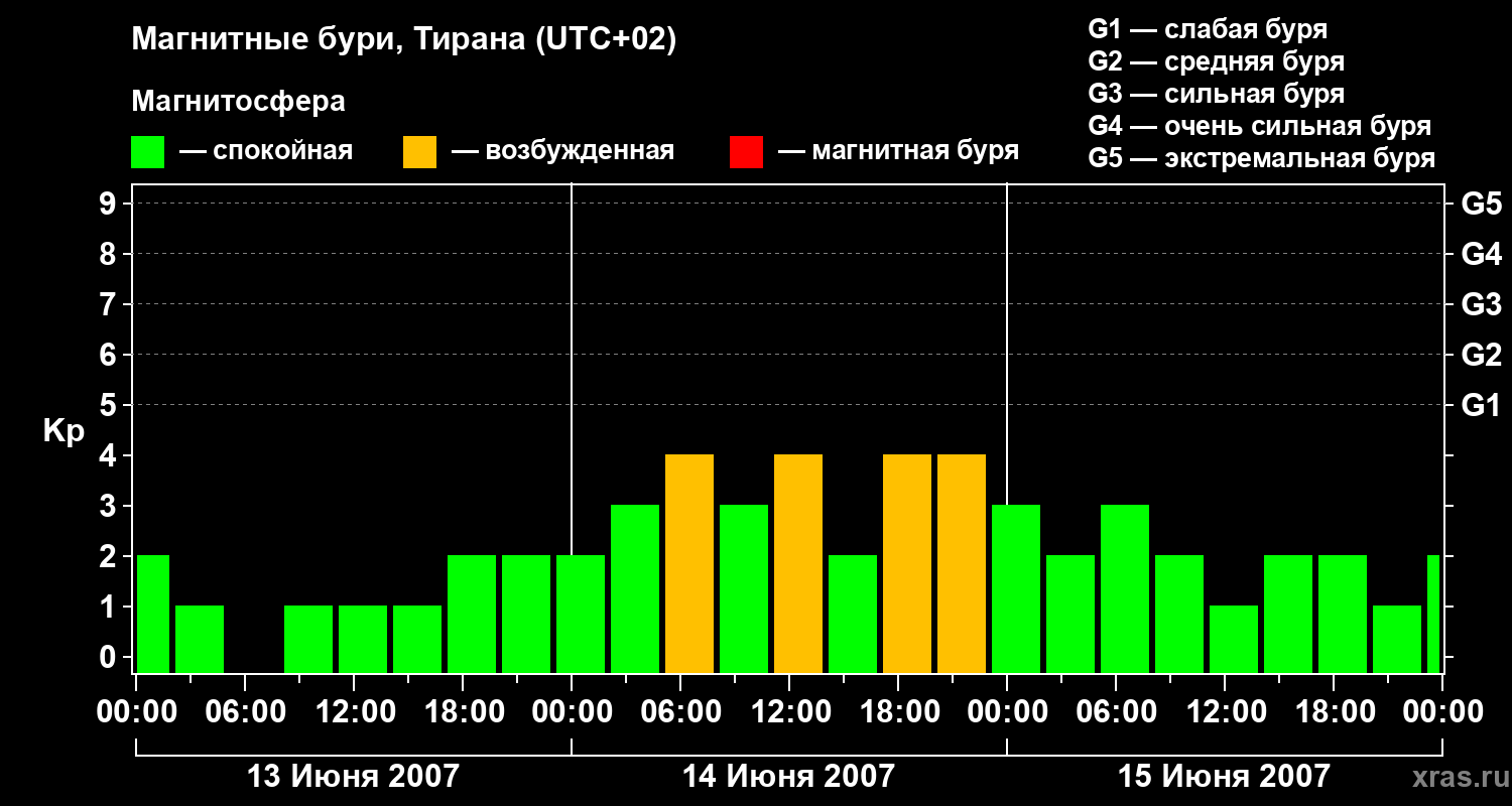 Изменения геомагнитного индекса Kp с 13 по 15 июня 2007 года для средних широт