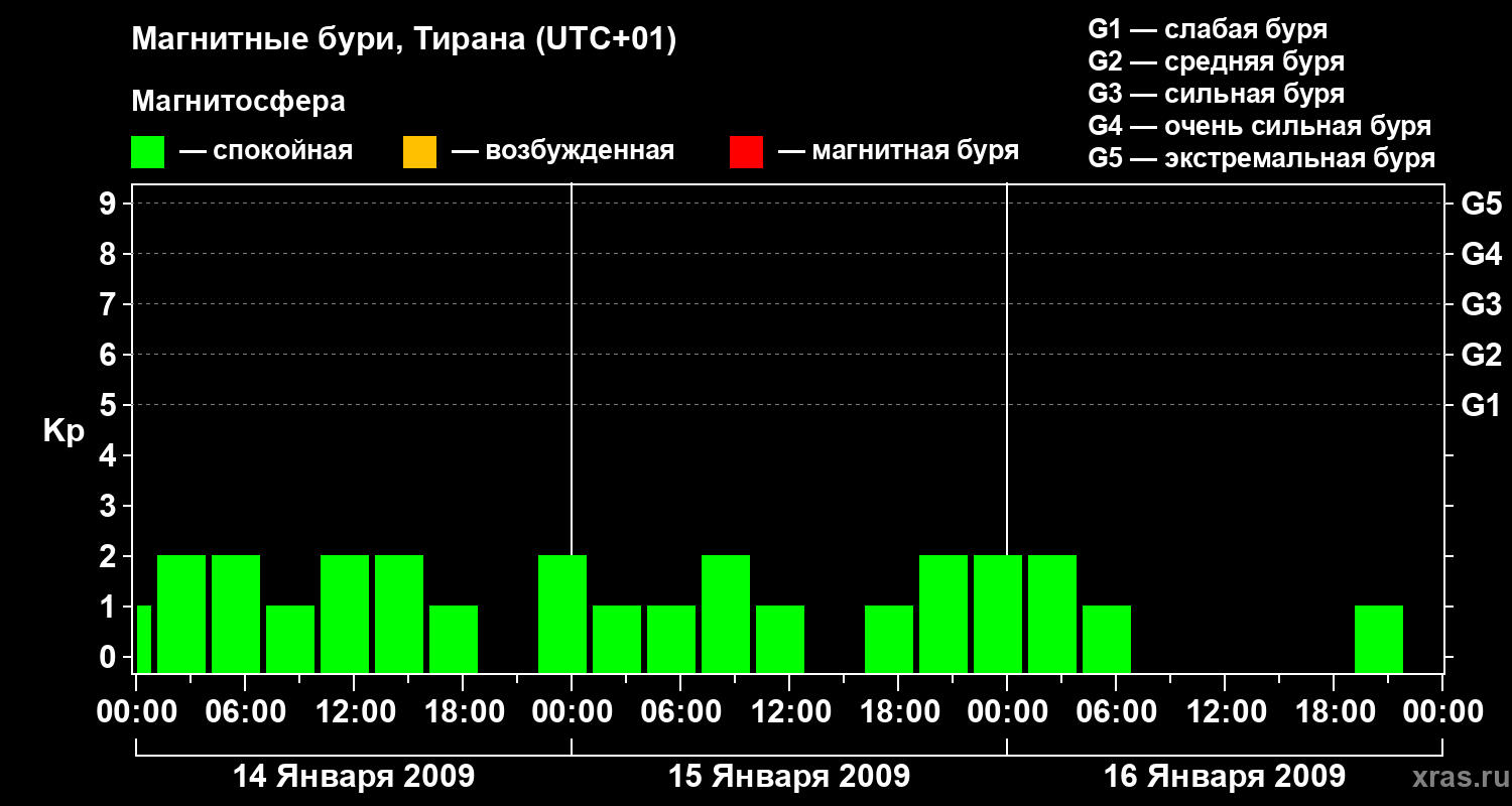 Изменения геомагнитного индекса Kp с 14 по 16 января 2009 года для средних широт