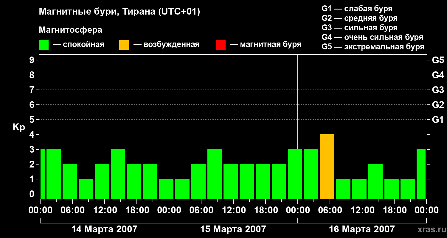 Изменения геомагнитного индекса Kp с 14 по 16 марта 2007 года для средних широт
