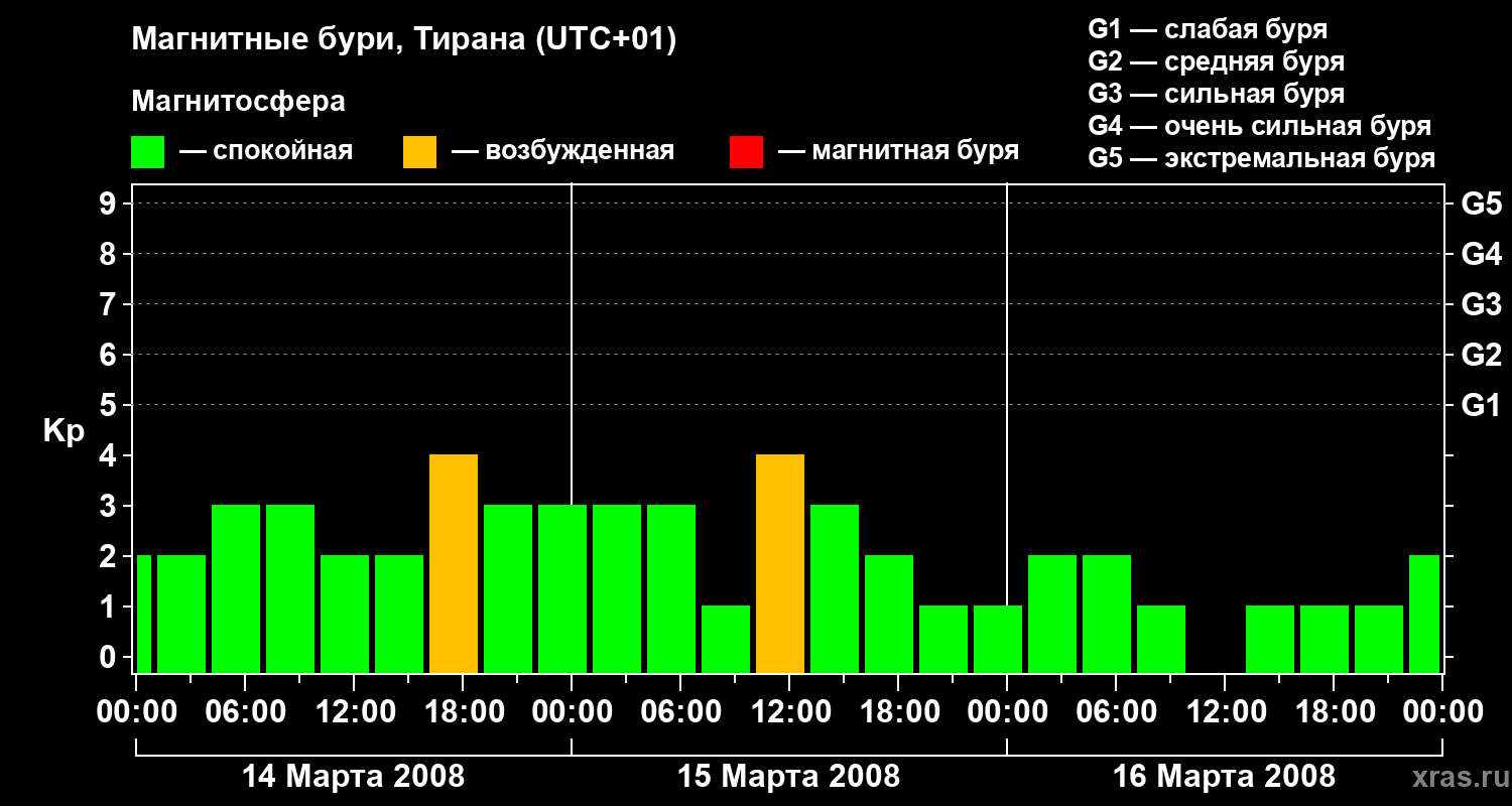 Изменения геомагнитного индекса Kp с 14 по 16 марта 2008 года для средних широт