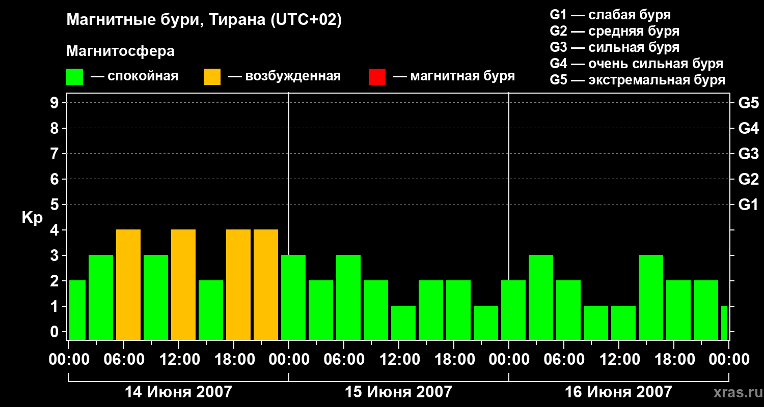Изменения геомагнитного индекса Kp с 14 по 16 июня 2007 года для средних широт