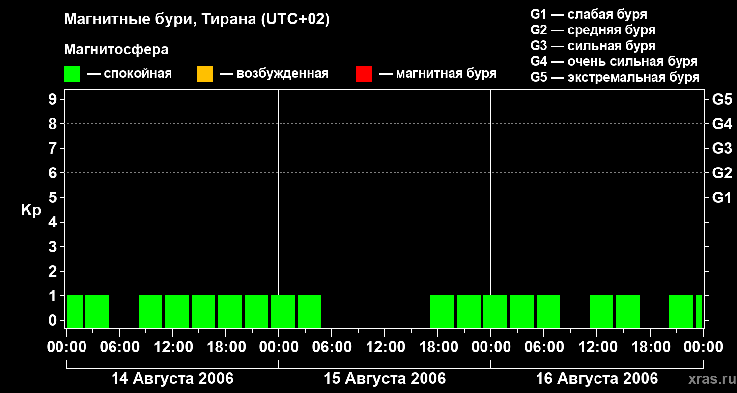 Изменения геомагнитного индекса Kp с 14 по 16 августа 2006 года для средних широт