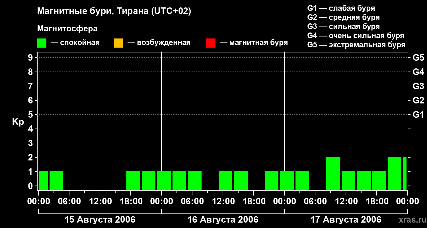 Изменения геомагнитного индекса Kp с 15 по 17 августа 2006 года для средних широт