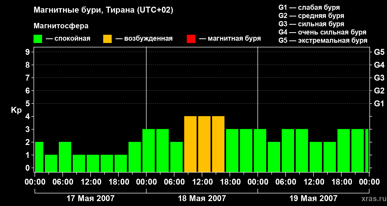 Изменения геомагнитного индекса Kp с 17 по 19 мая 2007 года для средних широт