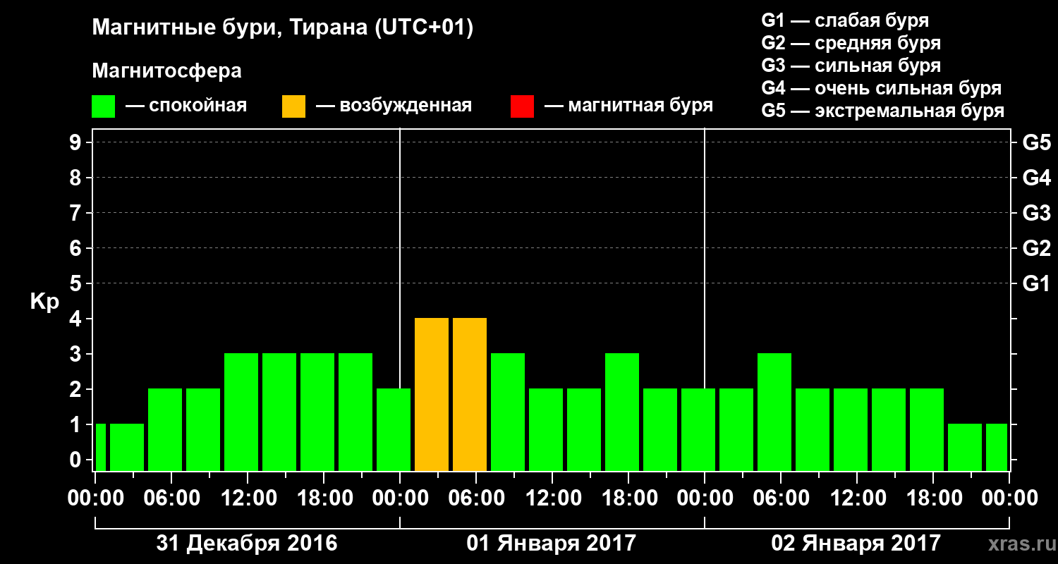 Изменения геомагнитного индекса Kp с 31 декабря 2016 года по 2 января 2017 года для средних широт