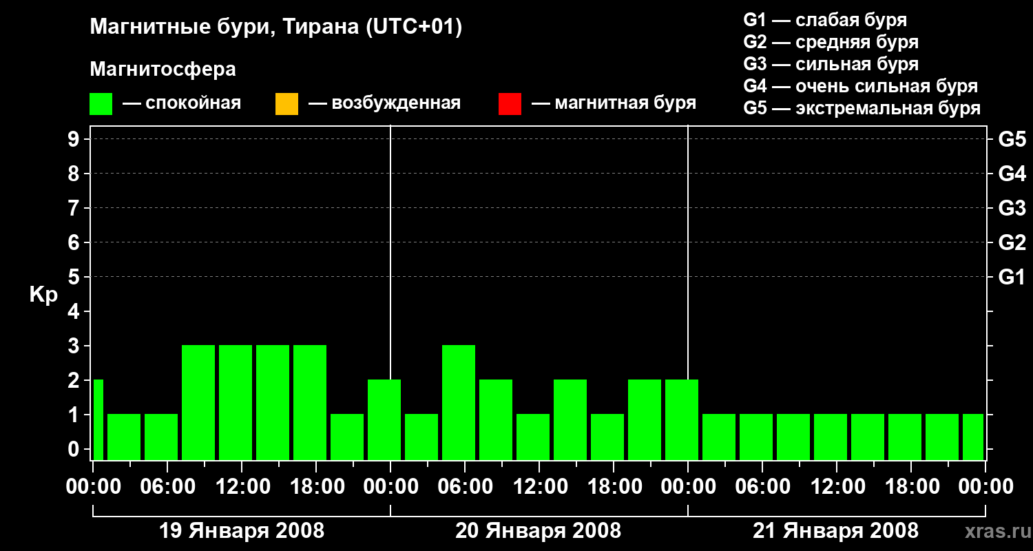Изменения геомагнитного индекса Kp с 19 по 21 января 2008 года для средних широт