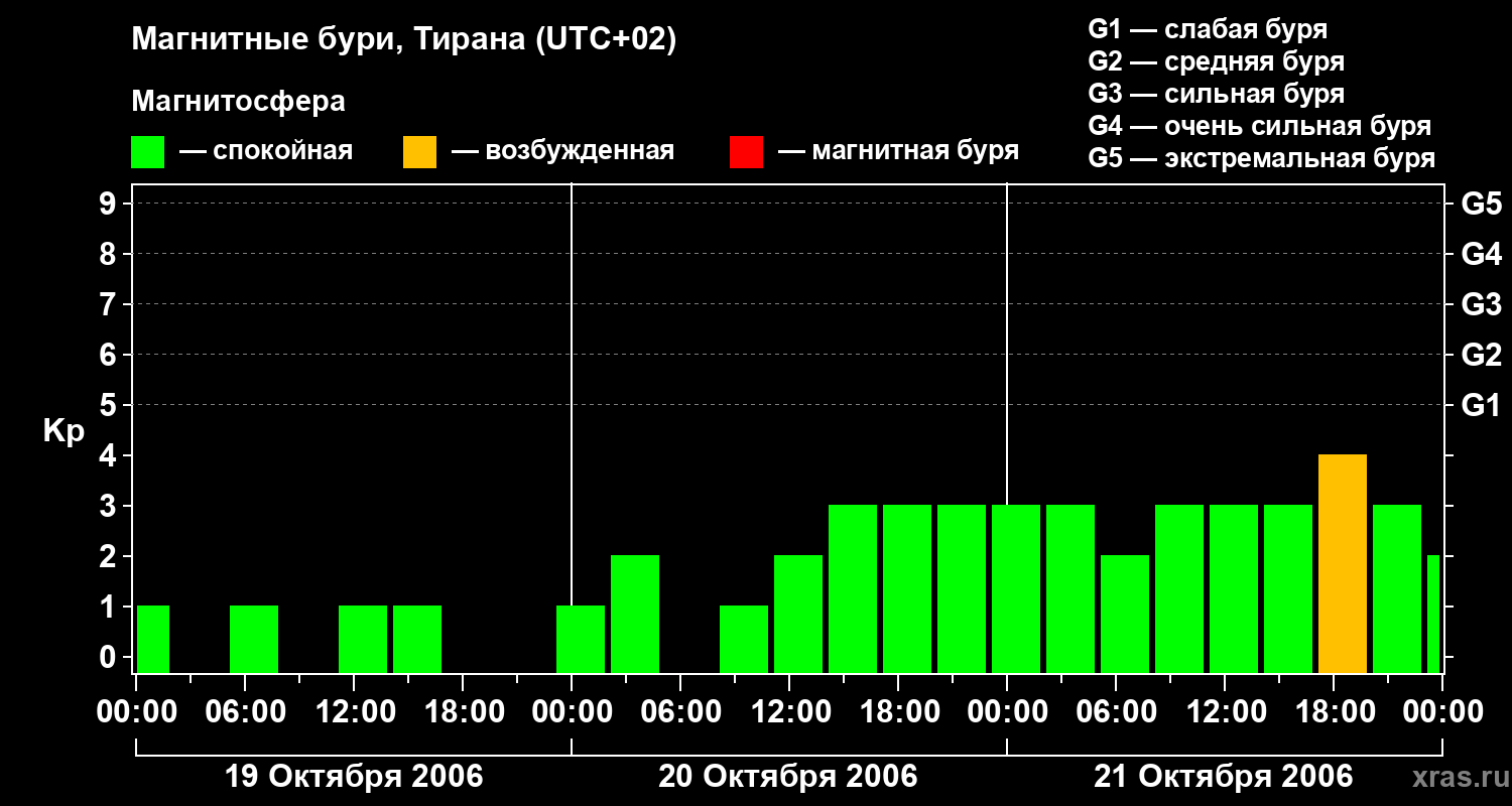 Изменения геомагнитного индекса Kp с 19 по 21 октября 2006 года для средних широт