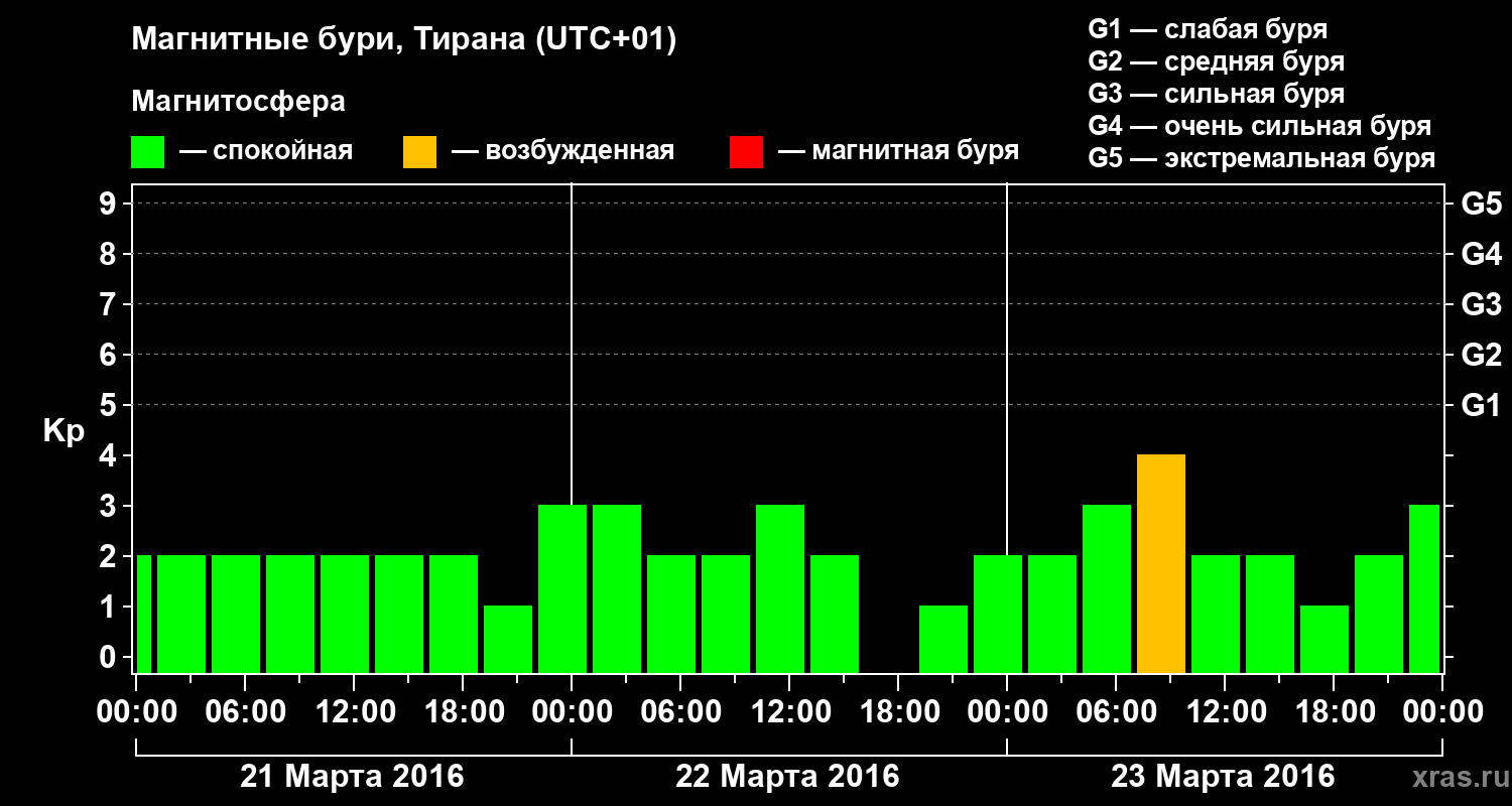 Изменения геомагнитного индекса Kp с 21 по 23 марта 2016 года для средних широт