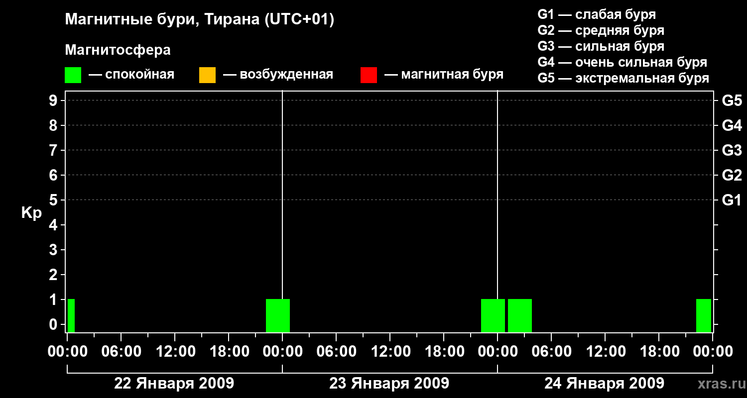 Изменения геомагнитного индекса Kp с 22 по 24 января 2009 года для средних широт