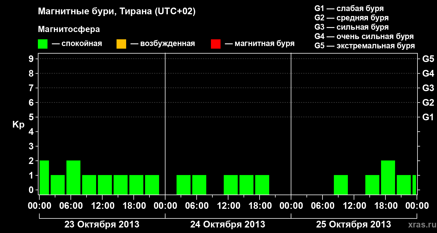 Изменения геомагнитного индекса Kp с 23 по 25 октября 2013 года для средних широт