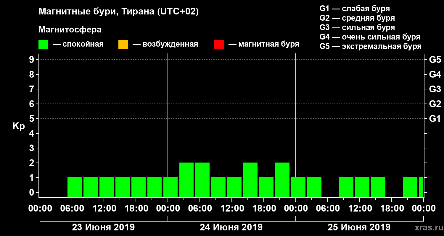 Изменения геомагнитного индекса Kp с 23 по 25 июня 2019 года для средних широт